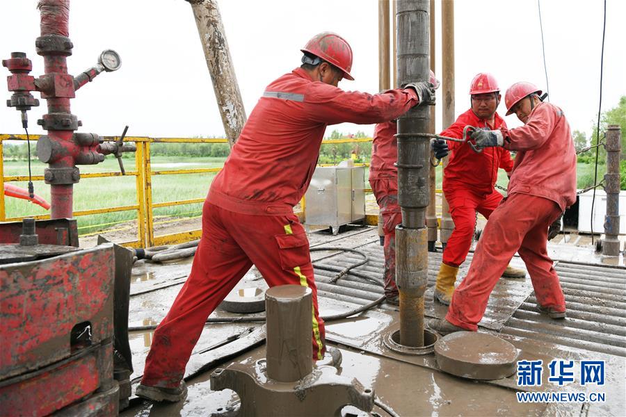 大庆油田1205钻井队的第21任队长张晶(右二)与工人们在进行作业(6月27日摄)。 新华社记者 王建威 摄