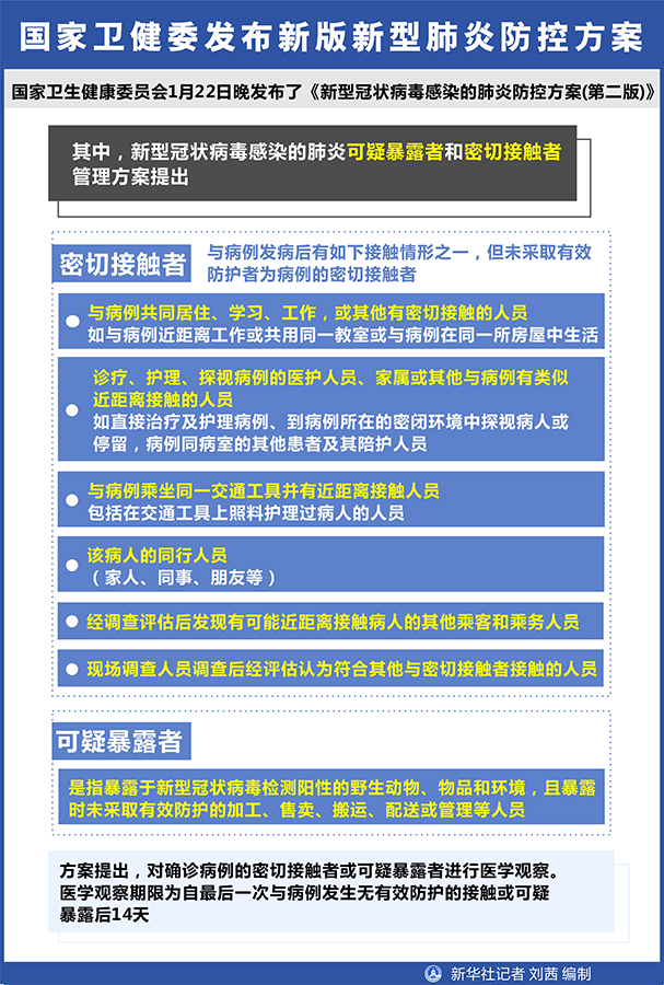 国家卫生健康委员会22日晚发布了《新型冠状病毒感染的肺炎防控方案(第二版)》。方案提到,基于目前对新型冠状病毒感染的肺炎的认识,疾病的潜伏期最长约为14天,病例存在人传人情况,参照SARS和MERS的防控经验判断,潜伏期可能无传染性。