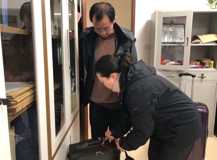 ▲老公前来送行,交代细节,果敢的护士长给行李箱绑上同事送的幸运结