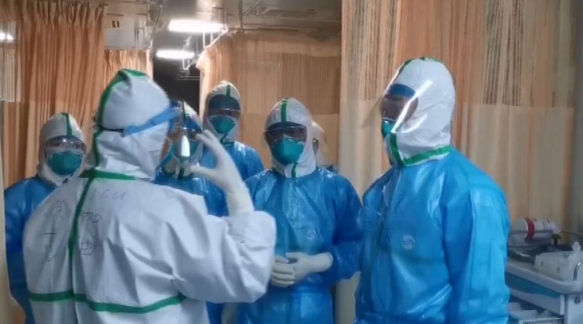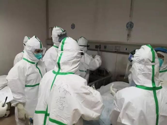 26日上午,空军军医大学医疗队首批值班人员一行19人进驻武昌医院重症监护病房,对危重患者进行逐一查看,并进一步完善救治方案,其余队员正在紧密进行感控培训。