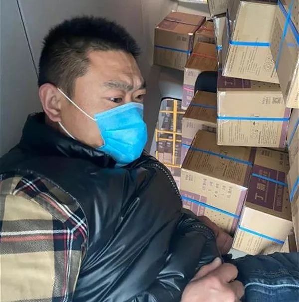 1月28日中午,山东退役军人王晓驱车千里,到达武汉府河收费站高速路口,将车上的10万双医用手套交给武汉的志愿者。