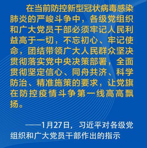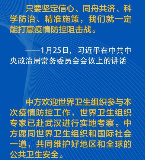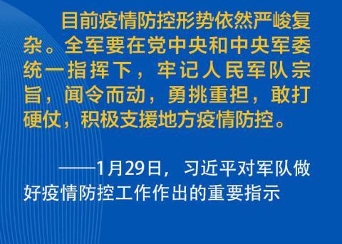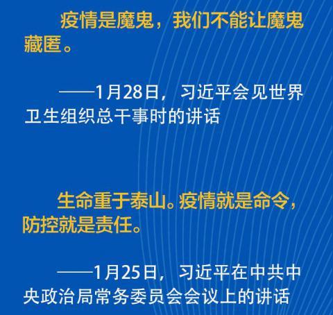 1月28日,国家主席习近平在人民大会堂会见世界卫生组织总干事谭德塞。习近平在会见中指出:“疫情是魔鬼,我们不能让魔鬼藏匿。”第二天,习近平又对军队做好疫情防控工作作出重要指示指出:“全军要在党中央和中央军委统一指挥下,牢记人民军队宗旨,闻令而动,勇挑重担,敢打硬仗,积极支援地方疫情防控。”