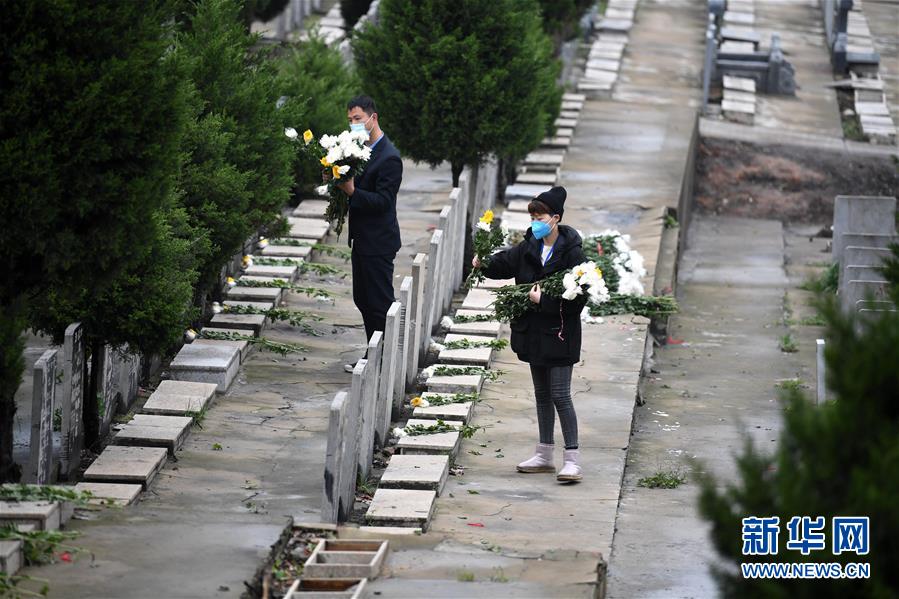 4月1日,在肥西县上派镇公益性公墓,提供代祭服务的工作人员在敬献鲜花。清明将至,安徽省肥西县上派镇各公墓通过开展免费鲜花代祭服务,保障居民在新冠肺炎疫情期间的祭扫需求。新华社记者 刘军喜 摄