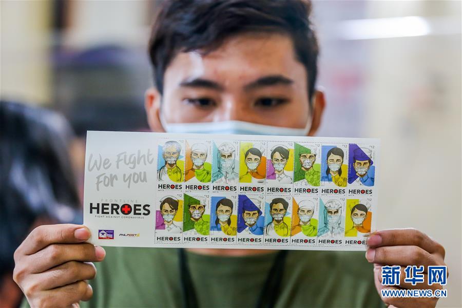 7月14日,一名工作人员在菲律宾首都马尼拉展示新发行的抗疫邮票。 菲律宾邮政公司近日发行特别邮票,将奋战在一线的抗疫人员描绘为“英雄”,向他们致敬。 新华社发(乌马利 摄)