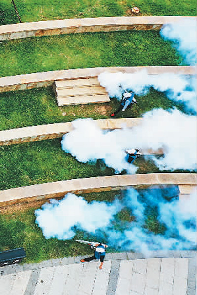 图为10月17日,江西省赣州市会昌县林岗公园,工人在对公共场所的绿化区域进行病媒生物防治消杀作业。 朱海鹏摄(人民视觉)