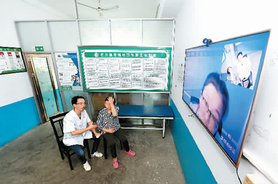 图为7月30日,陕西岚皋县蜡烛村卫生室的村医通过网络帮助群众进行远程问诊。 新华社记者 刘 潇摄