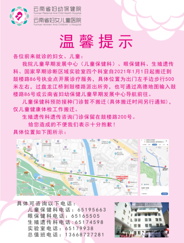 我院儿童早期发展中心(儿童保健科)、眼保健科、生殖遗传科、国家早期诊断区域实验室四个科室自2021年1月1日起搬迁到鼓楼路86号执业点开展诊疗服务,具体位置为出门左手边步行500米左右,过盘龙江桥到鼓楼路派出所旁,也可通过高德地图输入鼓楼路86号或云南省妇幼保健儿童早期发展中心导航前往。