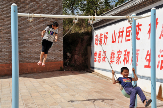 云南省大理州巍山县永建镇打竹村村民健身活动中心,姐弟俩快乐荡秋千。
