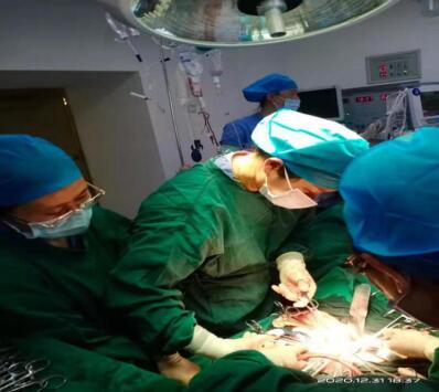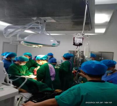 17:16分,取出一男活婴(经抢救后转新生儿科进一步治疗),由于产妇失血过多,凝血功能极差,取出胎儿后出血汹涌,手术创口极难止血,这又是摆在医生面前的一道难关。段芸主任沉着冷静,果断应对,在手术过程中,玉溪市人民医院产科马存丽主任、重症医学科专家杨俊明、麻醉科专家专家廖飞赶到手术室,共同为产妇进行子宫次全切除术。台上的手术医生使用各种方法竭尽所能为产妇止血,台下其他的医护人员继续进行纠正血容量,改善凝血功能,调节生命体征等支持治疗,患者术前、术中累计出血量约5000ml,术中生命体征极不平稳。