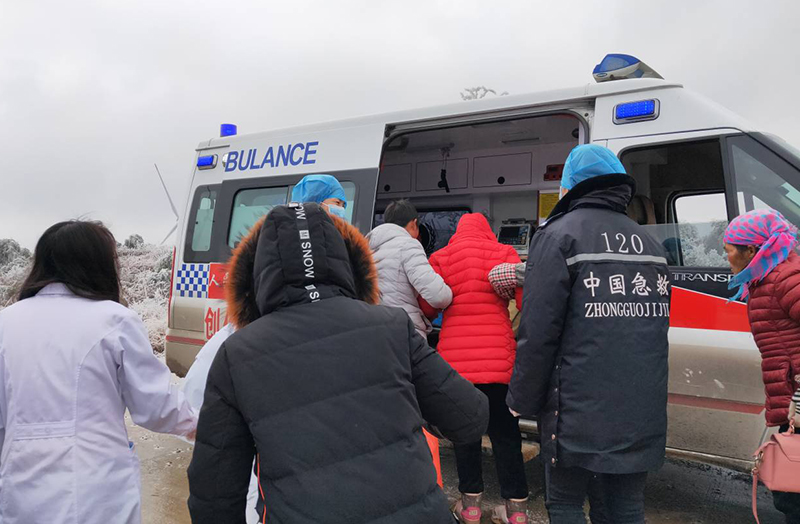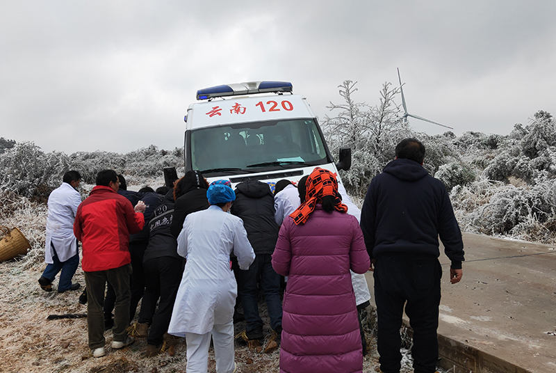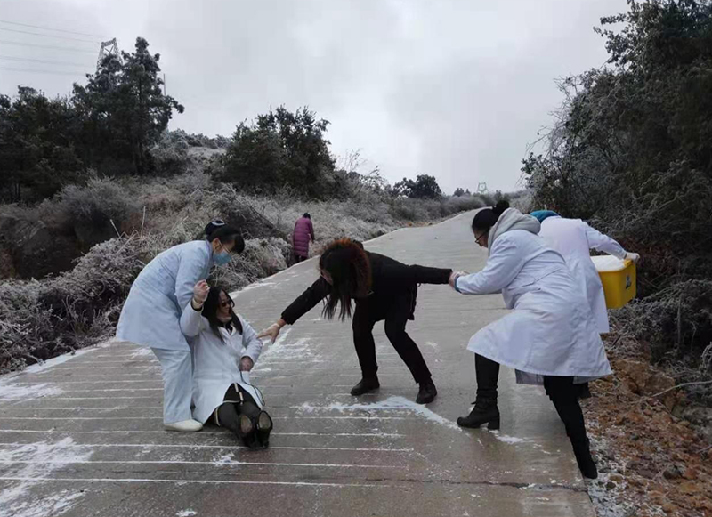 因路面结冰,在距离孕妇家还有6公里的山路时,前往救治的车辆行驶艰难,小心翼翼地走到山脚时打滑就再也无法前行,医护人员们只能下车携带急救物资徒步前往孕妇家中。