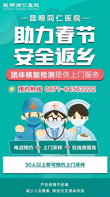 春运临近,近日,位于昆明南市区的昆明同仁医院推出了核酸采样上门服务。服务主要针对团体、单位,只要满30人就能预约采样上门服务。