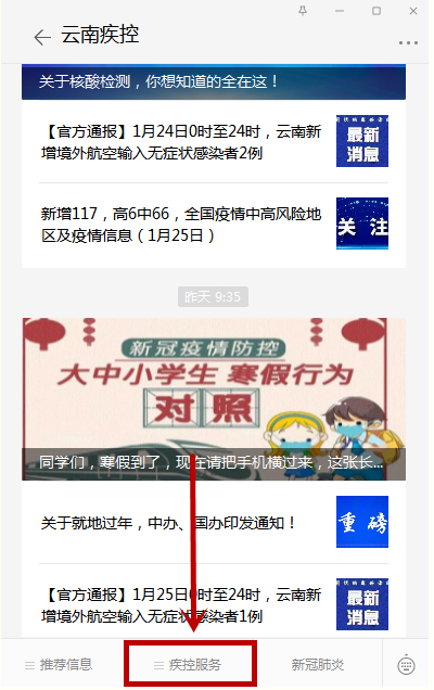 步骤一:进入“云南疾控”微信公众号页面,点击页面下方“疾控服务”专栏。