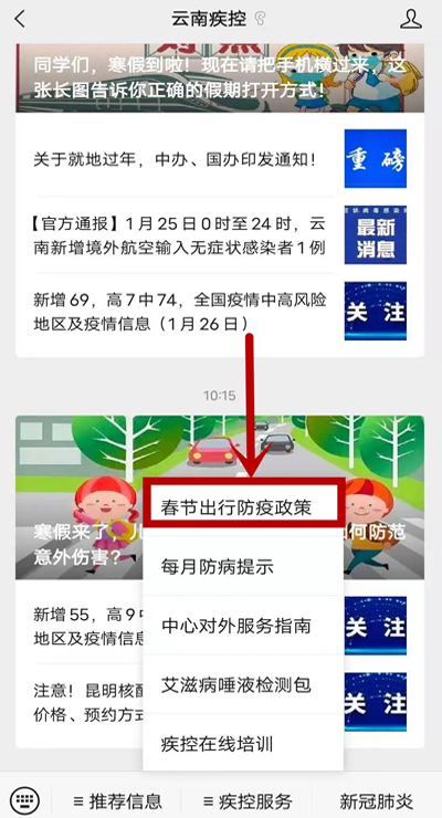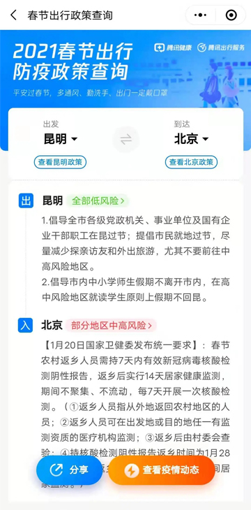 针对此问题,“云南疾控”微信公众号联合“腾讯健康”服务程序,正式上线了“春节出行防疫政策”查询功能。
