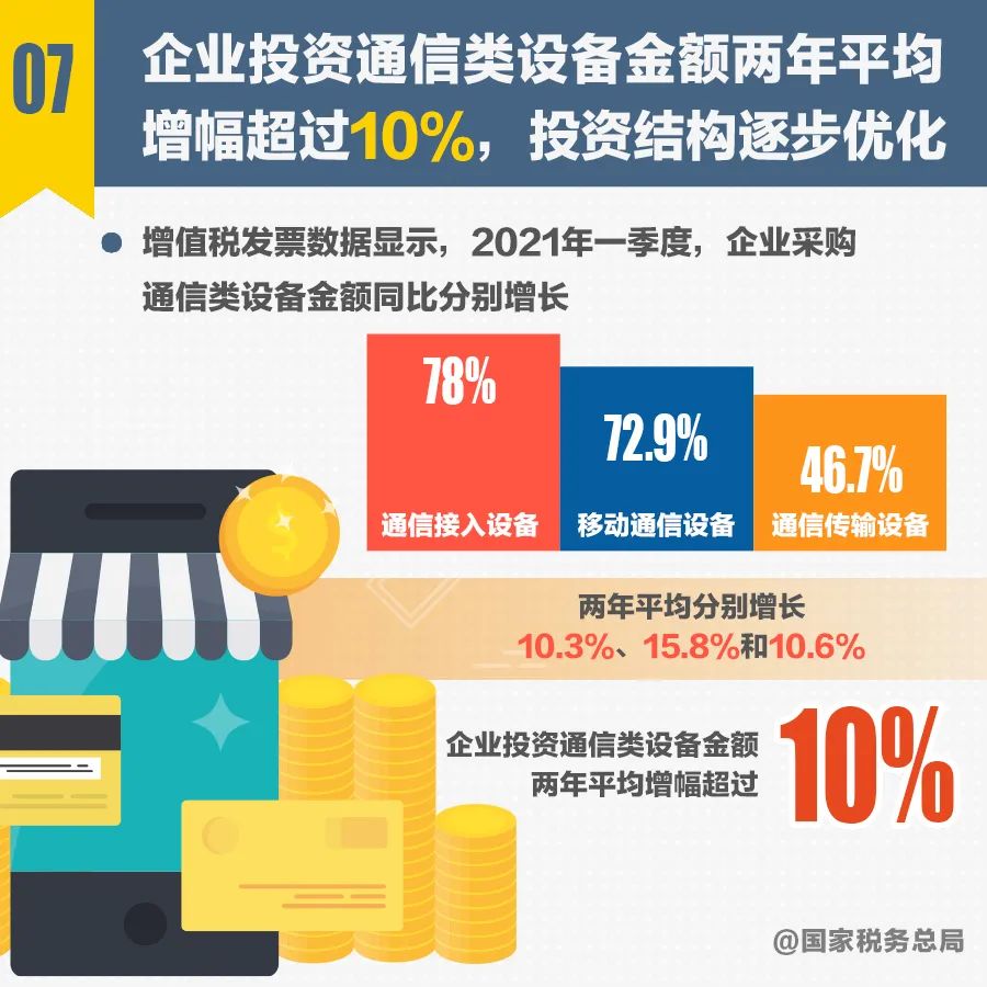 增值税发票数据显示,2021年一季度,企业采购通信接入、移动通信、通信传输设备金额同比分别增长78%、72.9%和46.7%,两年平均分别增长10.3%、15.8%和10.6%。