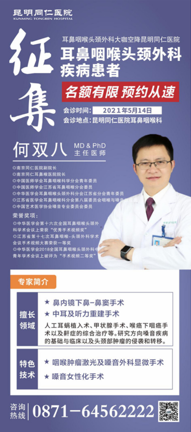 云南网讯(通讯员 罗宜子)受耳鼻咽喉头颈外科疾病困扰多年、久治不愈的患者朋友们,福音来咯!自4月17日,在昆明同仁医院成立“何双八专家工作站”后,著名耳鼻咽喉头颈外科专家何双八博士宣布将不定期来昆明同仁医院坐诊。但由于会诊时间有限,很多患者没能如愿约上号,因此为了帮助更多的患者,5月14日,何双八博士将再次来昆会诊,市民可以和专家面对面交流。