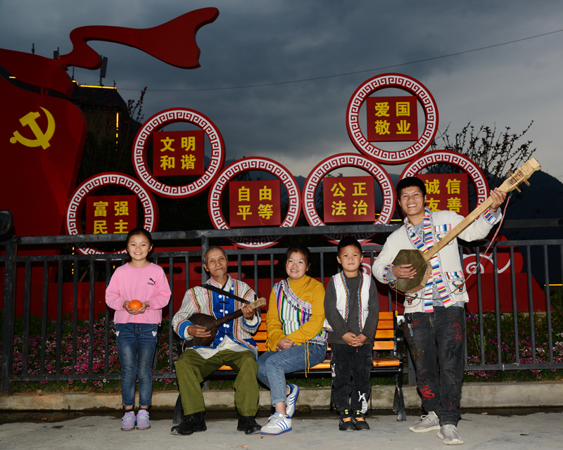 2021年春天的一个傍晚,云南怒江州贡山县茨开镇幸福社区,傈僳族余建文一家人在“社会主义核心价值观”的文明墙前合影,余建文和儿子弹起了傈僳族弦子。余建文的家庭是一个友善、文明、和谐的家庭,独龙族和傈僳族结合的家庭也代表着民族团结。暮色中,每一个成员的脸上都洋溢着快乐的笑容。