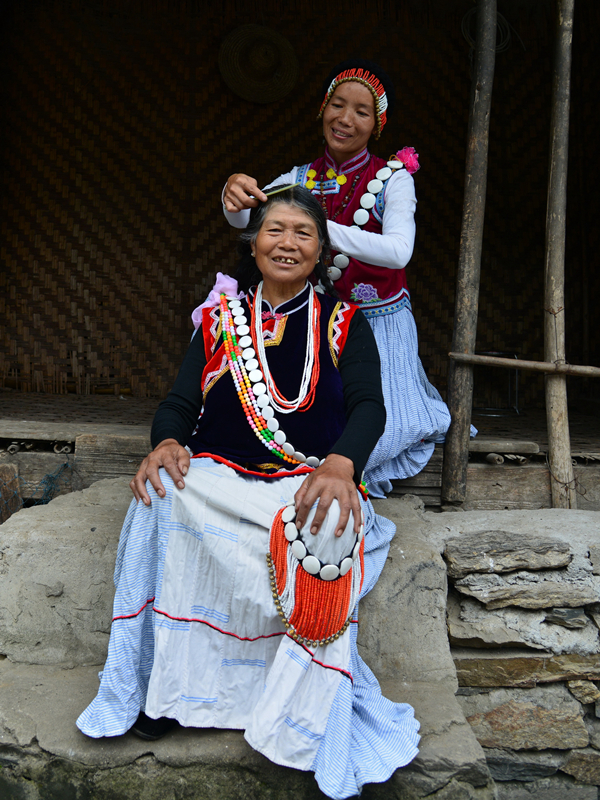 2014年8月6日,云南怒江州福贡县上帕镇腊竹底扒吉古村傈僳族妇女娜前生在为婆婆梳头。尊敬老人是傈僳族同胞的传统美德。