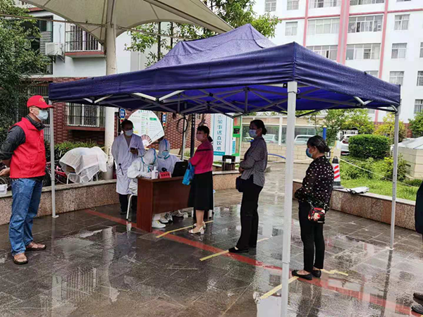 “这位大妈,你不用排队啦,你把你婆婆先推去检测吧!”队伍让开一条道后,在志愿者的协助下,大妈把坐在轮椅上80多岁的婆婆推送到检测台前,医生细心地为老人采集了样本。虽然阴雨绵绵,但是弥城苑检测现场却充满了暖意,社区干部来回协调奔走,门口警察站在细雨里维持秩序,核酸检测采样工作在有条不紊地推进。