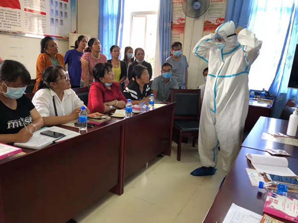 现场,全体医务人员进一步认真学习《新型冠状病毒肺炎防控方案(第八版)》,并开展了穿脱防护服培训,对穿脱防护服的操作流程、穿脱步骤、注意事项、防护及消毒处理步骤进行具体操作进行了现场示范和指导,使参会的每一位乡村医生都学习实践到如何穿戴、脱防护用品,掌握了穿脱防护服操作规范,为巩固疫情防控措施,提升疫情应急处置能力奠定了基础。