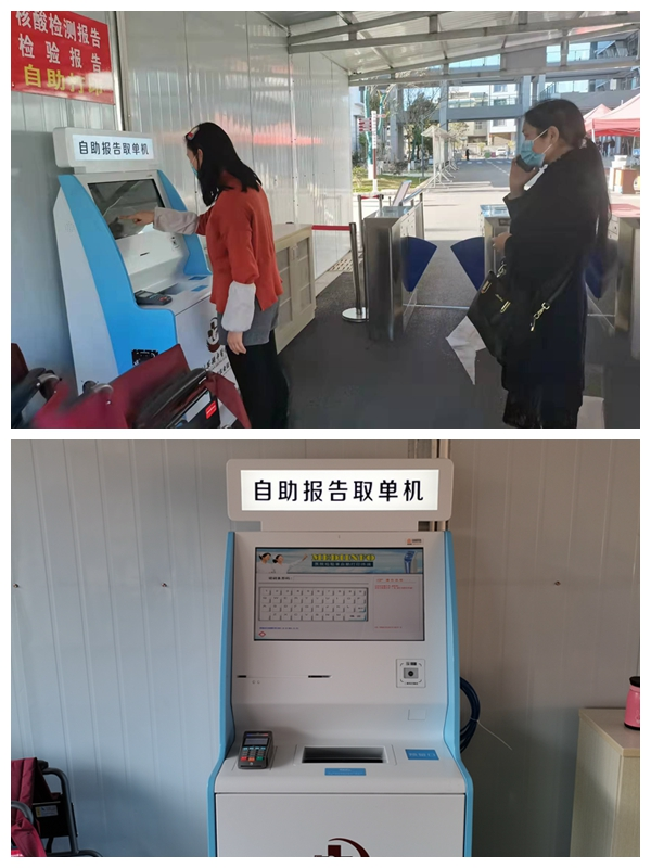 患者以往做完核酸检测需要自行到医院门诊二楼检验科排队领取报告单,对于不少初次到院的患者,由于不熟悉医院环境和就医流程,经常造成多次跑、从而耽误时间。为方便群众,避免人员聚集,医院在预检分诊入口处增设了检验报告自助打印机。