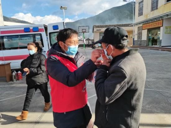 志愿者对问诊咨询的群众讲解正确佩戴口罩的方法及疫情防控知识。供图