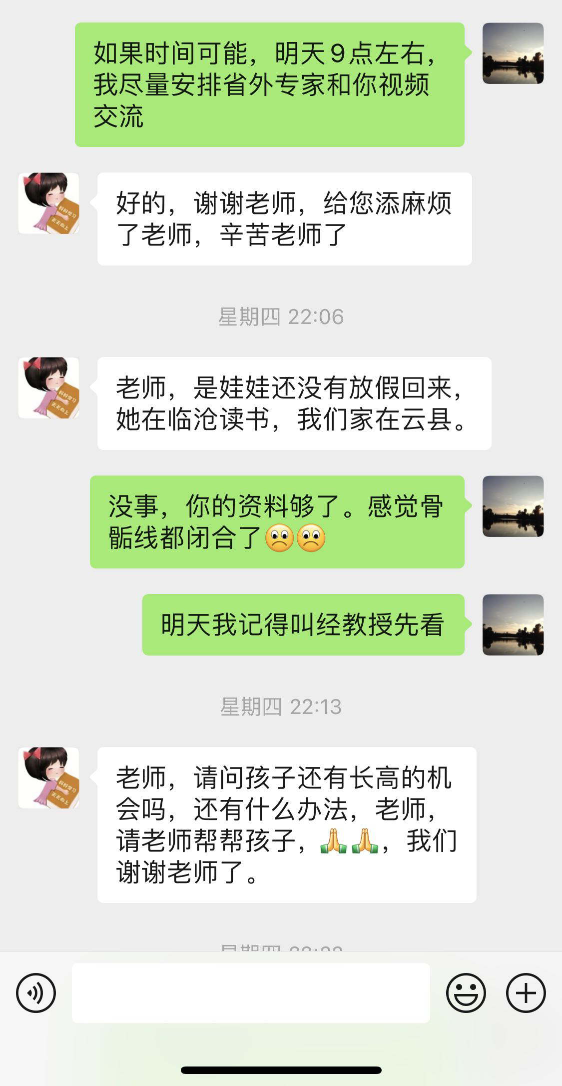 其中有两个家庭让人印象深刻。第一个家庭因为家远在临沧不能亲临现场参加义诊,这个家庭有一个15岁正读初三的女儿,初一时就曾因身高不够到当地医疗机构求诊过,但因当地医疗机构技术条件的限制未及时给予有效诊治,2年内患儿身高一直不见长,处在140cm水平,孩子也变得沉默寡言。得知这次义诊活动,家长加了罗永亮主任微信,罗主任看了骨龄片后感到非常遗憾和痛心,因为从患儿的骨龄片中看到患儿的骨骺已基本闭合,长高的机会非常渺茫,为了给家长争取最后一线希望,罗主任努力安排了远程“视频义诊”。在远程视频中,经教授和罗主任向家长详细询问了病史,分析了病情,母亲在视频里哭成了泪人。一直自责觉得是自己耽误了孩子,专家在视频里不断安慰患儿母亲,但内心也非常沉重,140cm的身高确让人难以接受。另一个家庭也是妈妈带着孩子前来咨询,不同的是她一个人带着三个孩子,大的两个孩子是龙凤胎5岁多,小的是个男孩还不到4岁,三个孩子身高都低于同性别、同年龄、同种族儿童平均身高的2个标准差,达到矮小标准,对这个家庭来说是个沉重的打击,不过不幸中的万幸,孩子年龄小还有机会干预,还来得及。