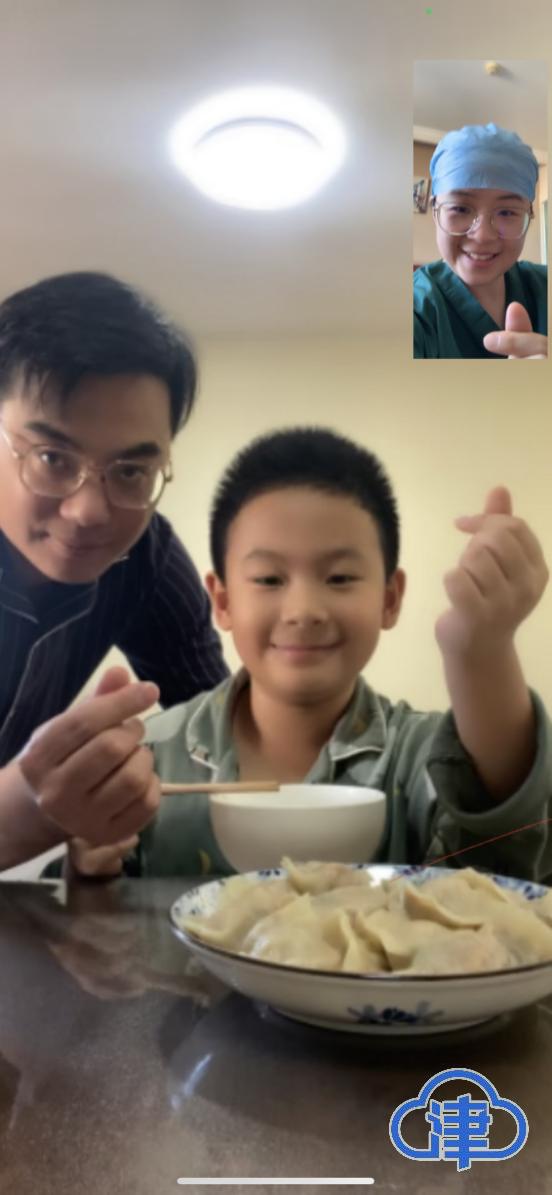 一边吃饺子、一边视频连线,今年春节,正在海河医院“红区”救治新冠肺炎病患的天津市第三中心医院心内科护士周宛盈与家人们用“云连线”的方式共度了除夕之夜。虽然时空相隔,但是乐观开朗的周宛盈用自己满满的正能量,“平常心”看待节日里的一线坚守,也用责任和担当为自己二年级的儿子何奕鸣做出了榜样。
