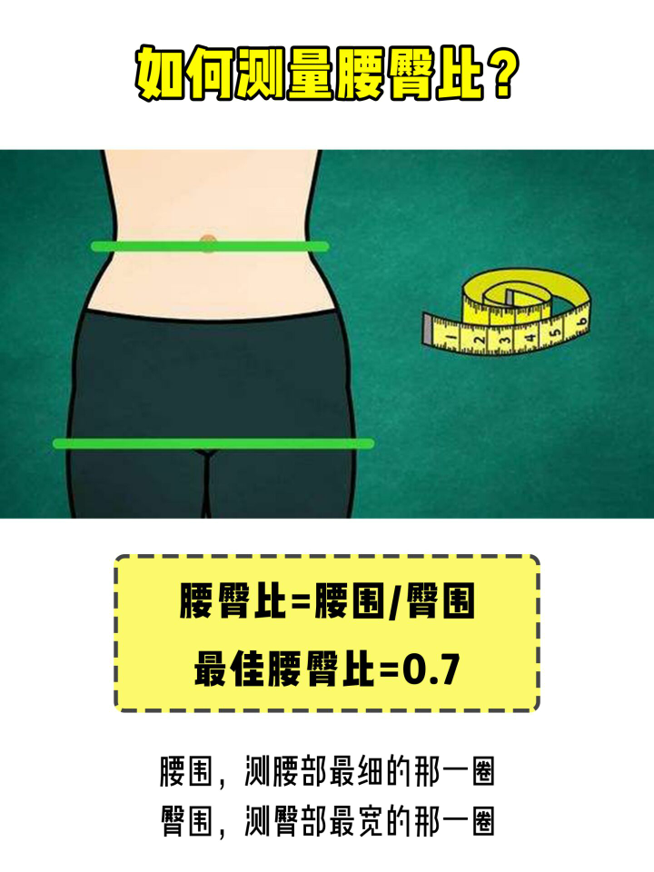 腰围身高比(Waist-to-height ratio,WHtR)是指腰围数值与身高数值的比值【WHtR=腰围(cm)÷身高(cm)】。国际上大多采用WHtR>0.5作为腹型肥胖的评判标准,所以建议将腰围控制在身高的一半以下。