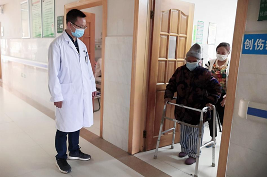 在医护团队的精心护理下,手术后第三天后,老人在助行器及家属辅助下就能下床慢走了。