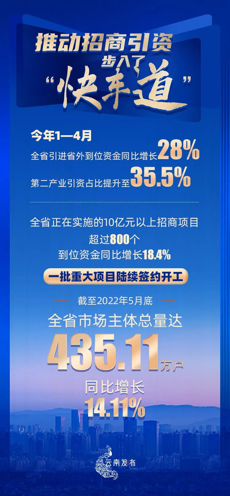 出台《云南省人民政府关于进一步优化营商环境促进市场主体倍增的意见》及“8+2”配套培育计划,推动全省市场主体培育驶入了“快车道”。截至2022年5月底,全省市场主体总量达435.11万户,同比增长14.11%。