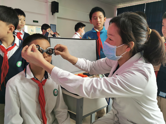 “在爱眼日这几天,我们都会开展‘眼科流动博物馆进校园’的活动,相比起爱眼护眼的科普讲座,这个互动体验受到更多低年龄段孩子的喜爱。”杨槐主任说,相比起传统、枯燥的学习方法,此次活动借助相关设备,让同学们进行模拟体验环节,感知近视后的“视界”以及神奇的立体视觉,并且在讲解的同时,还带领他们亲自动手组装眼球模型,引导孩子们去发现眼睛的无穷奥秘,从而科普眼科知识,帮助他们更好地养成健康用眼的习惯。