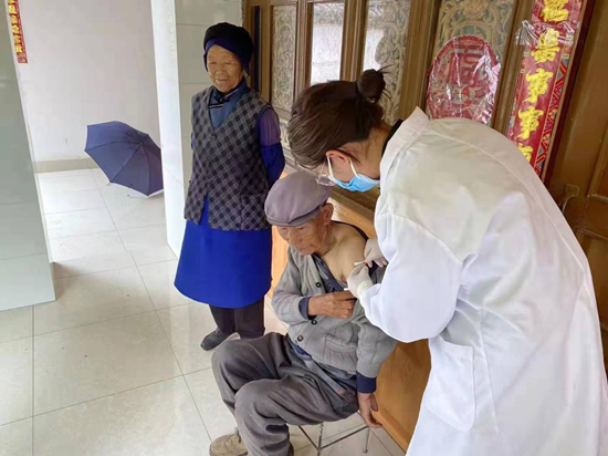 三营镇白草村委会的喻大爹,家中离卫生院路程较远,子女均外出打工,无法自己前往卫生院接种。了解到这一情况后,在三营镇人民政府和村委会工作人员的带领下,卫生院的医务人员前往喻大爹家中,为喻大爹接种了第一剂新冠疫苗。
