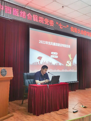 会议开始,党委书记龙鲸向全体党员讲授《坚定信念 努力奋斗,以优异成绩迎接党的二十大胜利召开》党风廉政建设专题党课。龙鲸书记从筑牢信仰之基、心存敬畏之念、依法履职用权三个方面讲授在党风廉政建设方面可能存在的问题,同时希望全体党员在第二个百年奋斗的征途上,能够做好表率、坚定信心、鼓足干劲、迎难而上,为实现医院的快速发展贡献自己应有的力量,以优异成绩向党的二十大献礼。