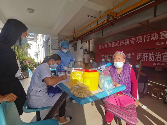 7月24日,在“7.28世界肝炎日”来临之际,孟连县卫生健康局组织医务人员到孟连县社会福利中心为17名老同志开展健康义诊、丙型肝炎防治及打击整治养老诈骗专项宣传活动。