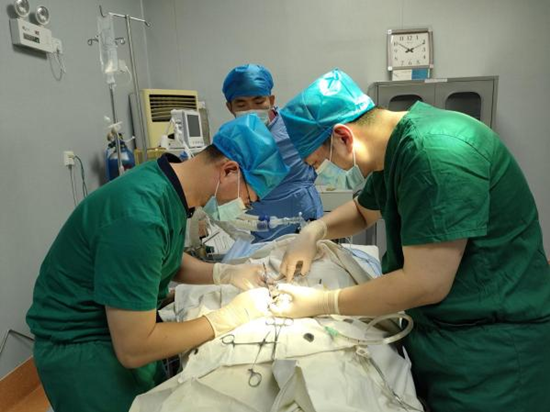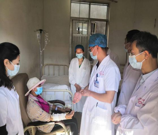 专家组团队查房结束后,为一名老年患者实施了二期清创缝合术,还为一名骨折患者,因在外包药致皮肤破损,给予换药后石膏固定。