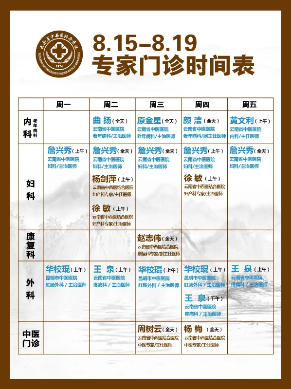 另外,该院还有一个患者福音传来:8月15日至19日期间,云南省中医医院、昆明市中医医院多名专家,将持续在云南省中西医结合医院坐诊。