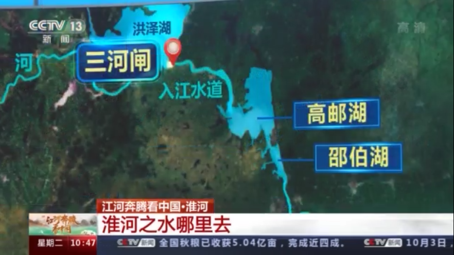 淮河流入洪泽湖后,干流通过三河闸进入淮河入江水道南下,经过高邮湖邵伯湖,进入长江。