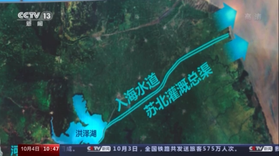 在洪泽湖东面,淮河入海水道和苏北灌溉总渠是两条平行的人工河道,一直向东,直通黄海。洪泽湖还有一条入海通道,起点在洪泽湖二河闸,经淮沭河、新沂河入黄海。