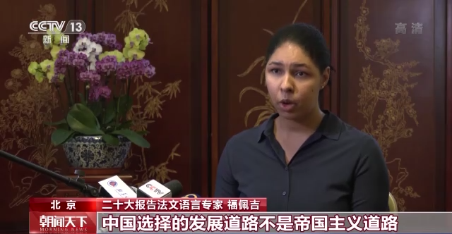 二十大报告法文语言专家 福佩吉:中国选择的发展道路不是帝国主义道路、不是殖民主义道路,也不是霸权主义道路,而是一条和平的发展之路。其发展成果不仅由中国人民共享,全世界人民都能因此获益。我觉得这和人类命运共同体是一样的。习近平主席提出这个理念时,真的是为了推动世界和平发展。