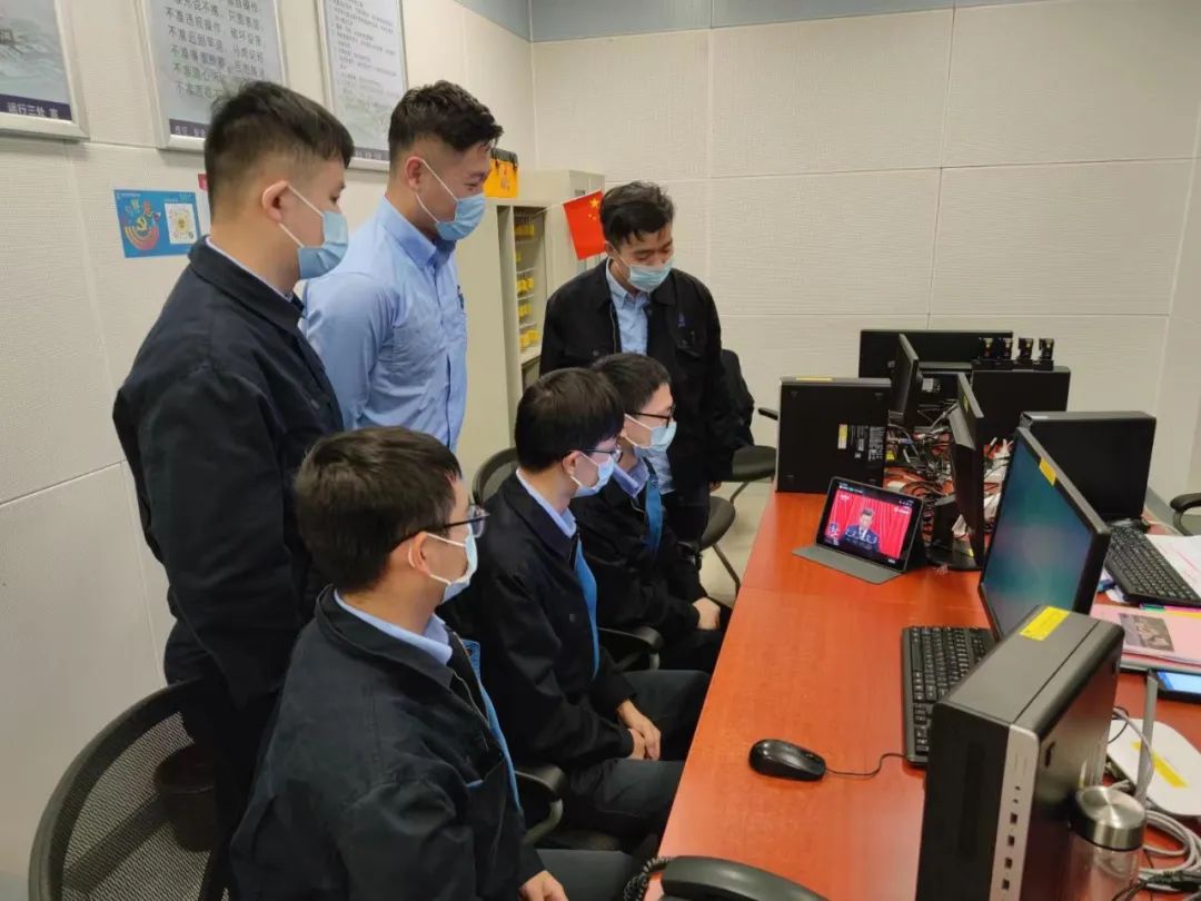 “华龙一号”党员与青年代表在示范工程现场值班室观看党的二十大开幕会直播。中核集团供图
