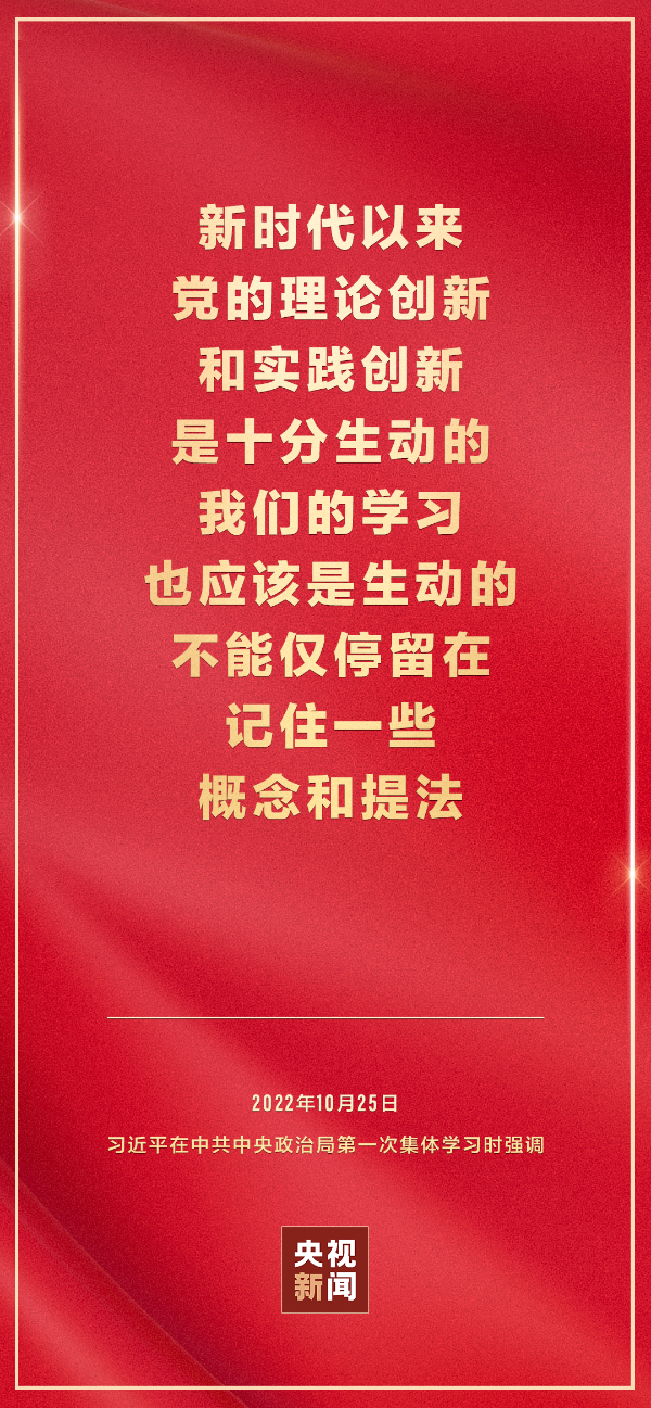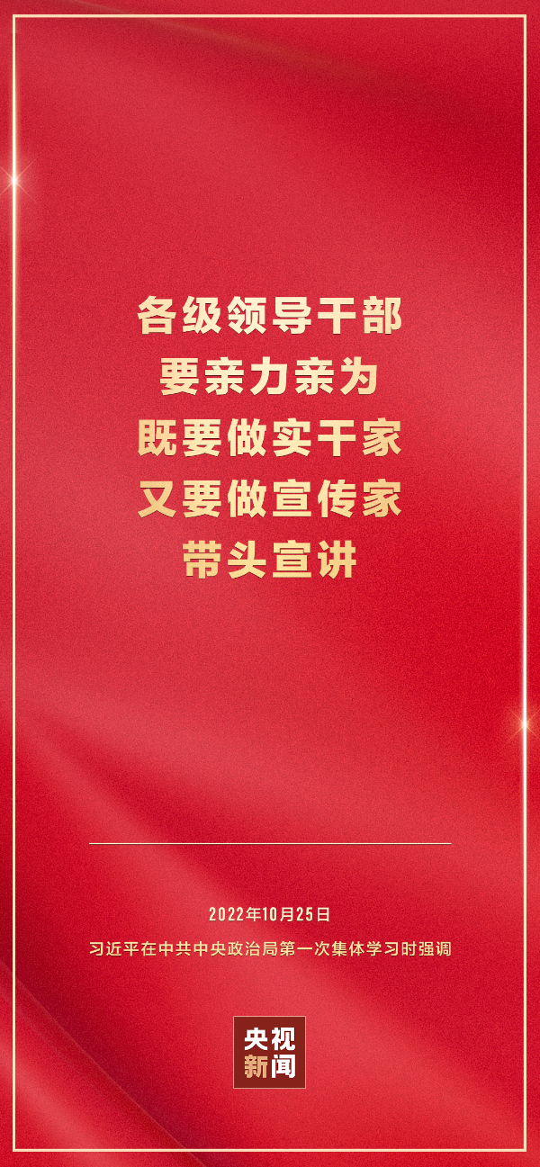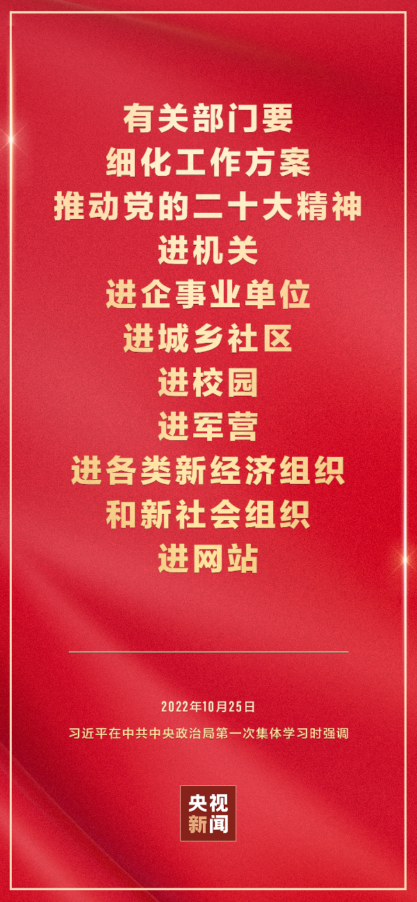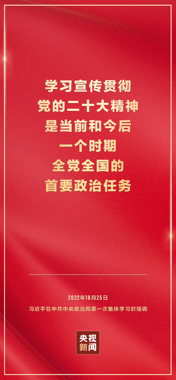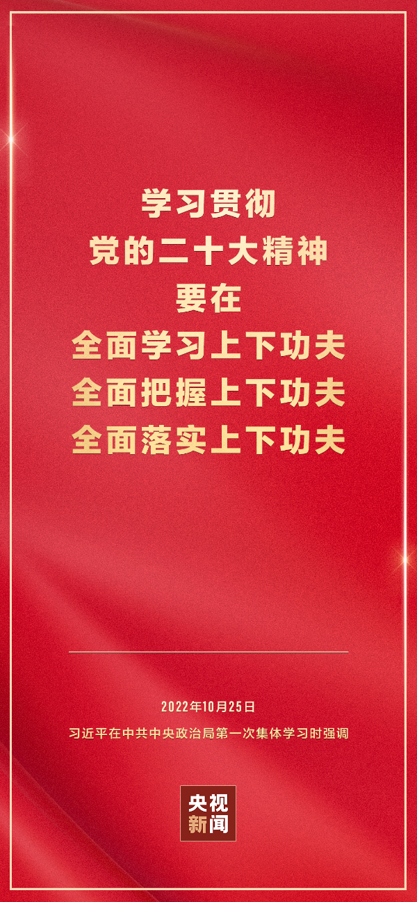 二十届中共中央政治局10月25日下午就学习贯彻党的二十大精神进行第一次集体学习。中共中央总书记习近平在主持学习时强调,全党要在全面学习、全面把握、全面落实上下功夫,坚定不移把党的二十大提出的目标任务落到实处,奋力夺取全面建设社会主义现代化国家新胜利。