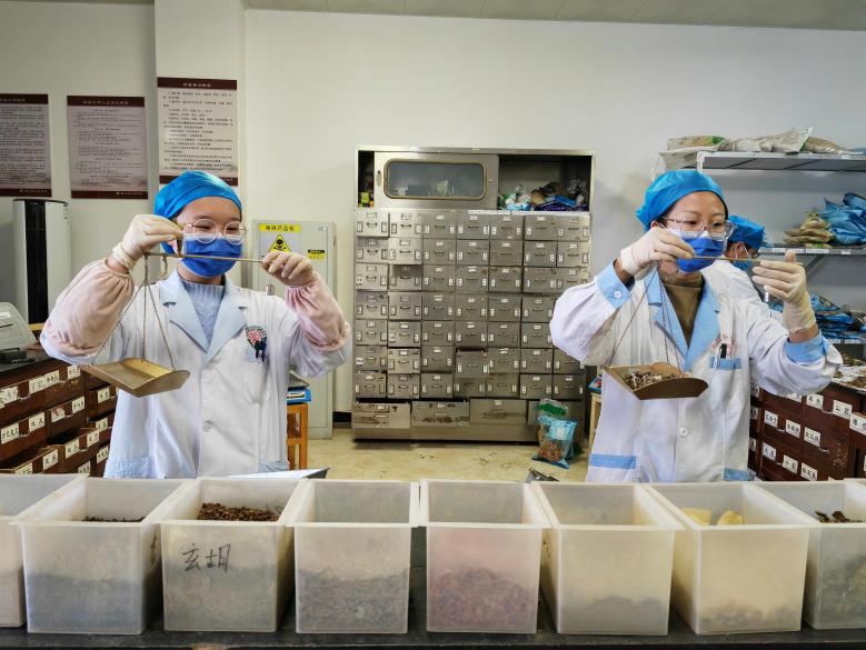 12月16日,笔者在县紧密型医共体中医药健康管理服务中心(县中医医院)看到,中药房医务人员在为两款“防疫小香囊”分别按方抓药,治未病科的医务人员在把抓好的药分别混合后放入定制布袋中制成香囊。