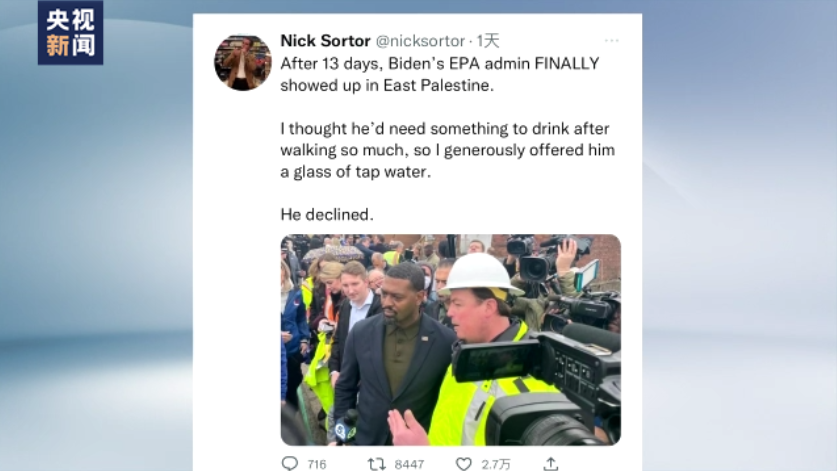美国俄亥俄州有毒化学品运载列车脱轨致有毒气体扩散事件仍在发酵。事件发生近20天后,当地时间21日,美国环境保护局局长等官员对事故发生地东巴勒斯坦城进行了访问,并与当地居民和社区人员举行会议,承诺水质安全。但有居民在后续接受采访时表示,当地还有很多地方尚未进行水质检测,他们仍然对水质安全感到担忧。