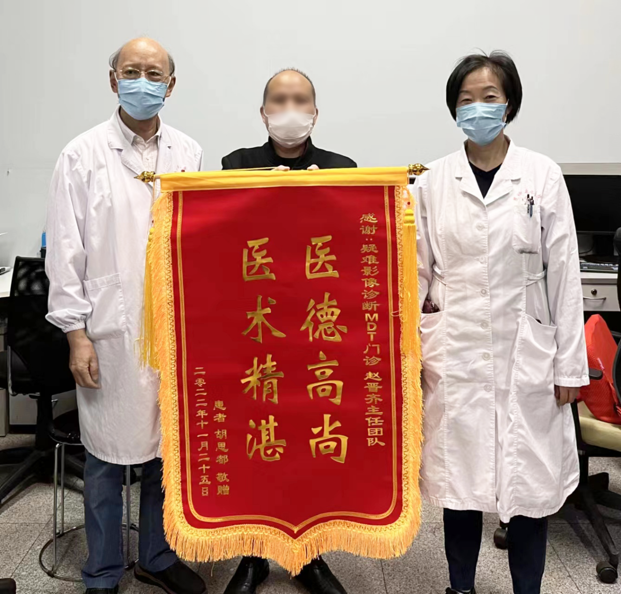 胡先生终于出院了,他还特意给“疑难影像诊断MDT门诊”送来了感谢的锦旗,亲自送到已过古稀之年的赵晋齐老主任手里,表达他对赵老和消化科全体同仁的感激之情。