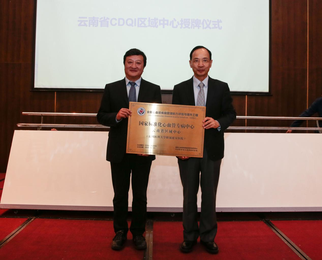 国家卫健委医院管理研究所心血管介入诊疗技术培训专家委员会主任暨首都医科大学附属北京安贞医院马长生教授向昆明医科大学附属延安医院授牌“国家标准化心血管专病中心云南省区域中心”。