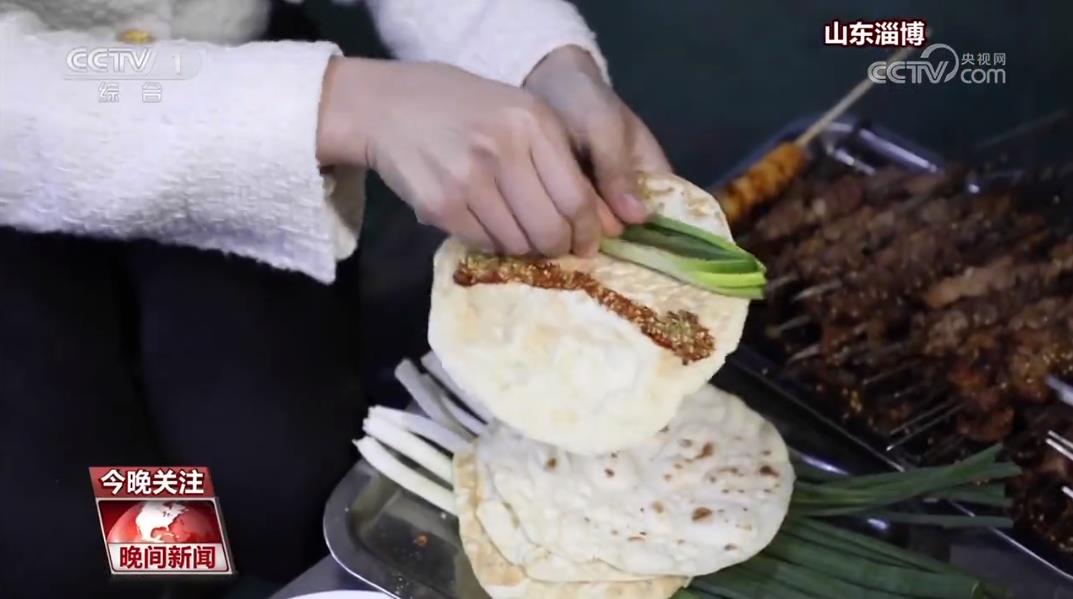 正味烧烤老板 刘静:蘸这个酱,然后蘸料,很多种吃法都有了。说小炉子代表温度,小饼代表包容,小葱代表豪爽。这就是我们淄博,常来我们淄博。