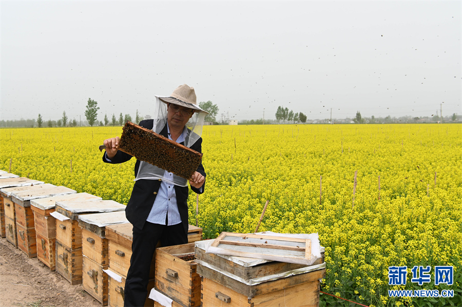4月11日,河南省沁阳市崇义镇南里村,一名放蜂人在查看蜂箱内蜂群情况。
