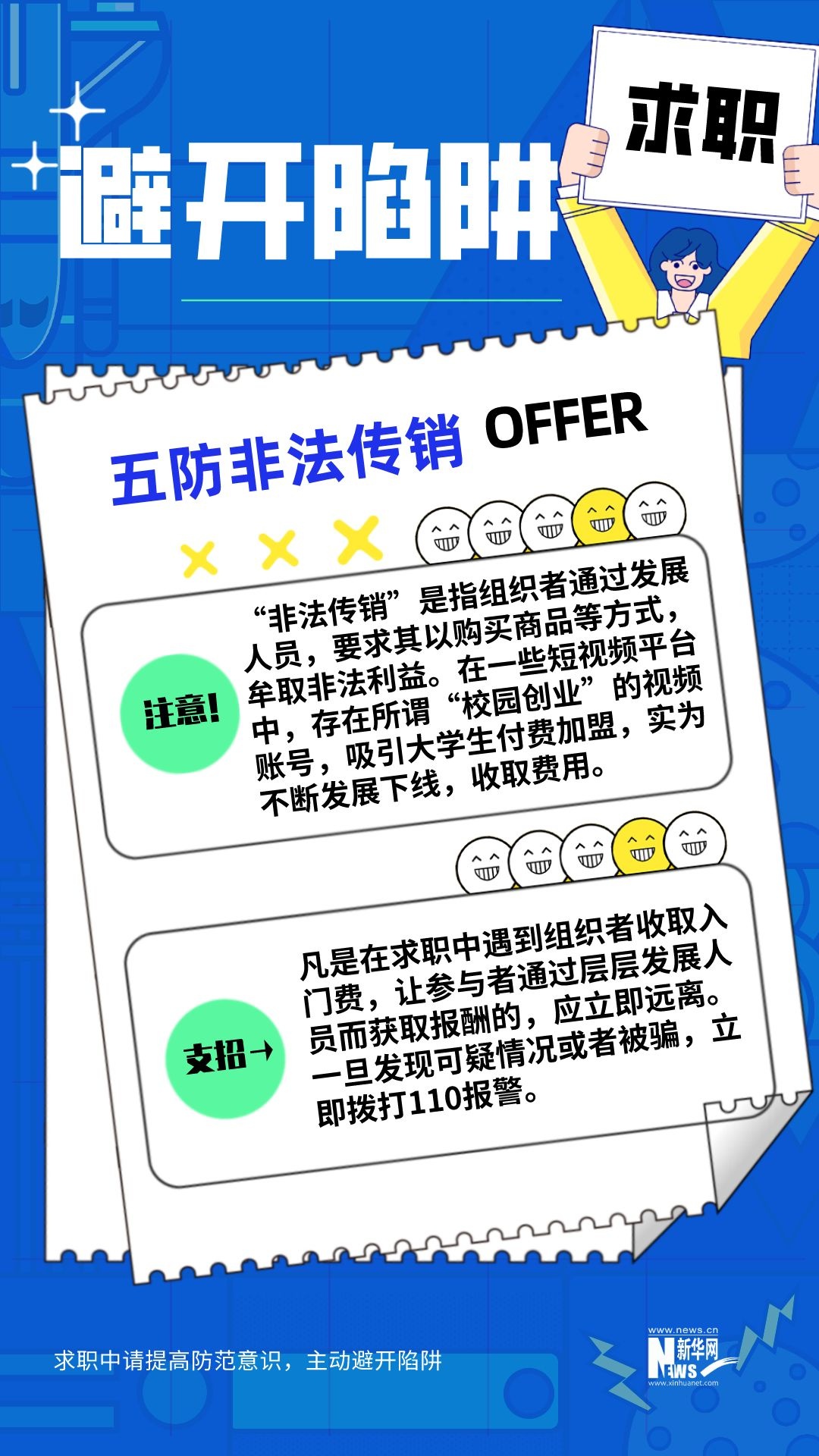 当前正值高校毕业生求职高峰期,一些不法分子借此挖“坑”设陷, 利用“高薪低门槛”“付费内推”“付费实习”等手段诈骗钱财,损害毕业生就业权益,甚至误导﹑诱骗一些大学生从事传销、信息网络犯罪等活动。如何避开这些陷阱?这份求职“五防三要”攻略请掌握。