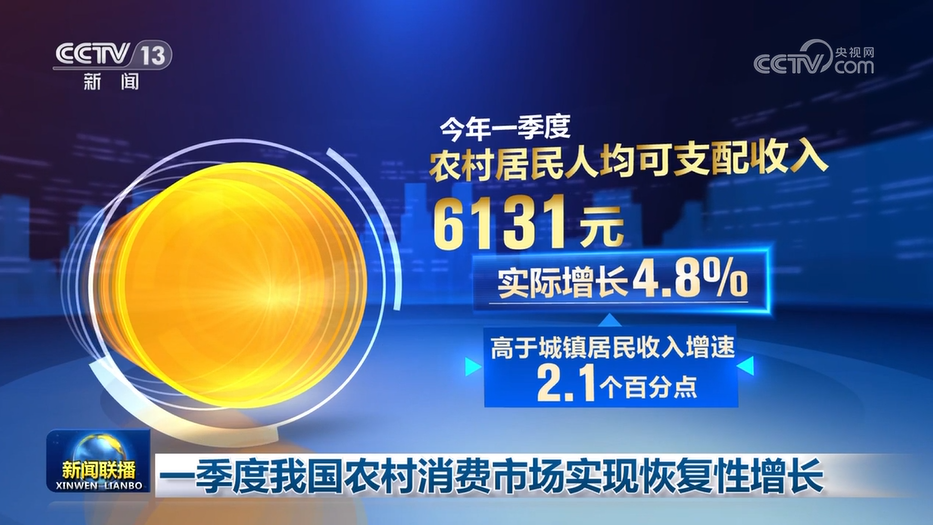 今年一季度,农村居民人均可支配收入6131元,实际增长4.8%,高于城镇居民收入增速2.1个百分点。农民收入的增长,进一步拓展了农村消费空间。
