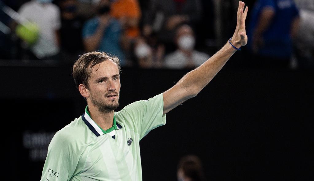 梅德韦杰夫在2022年澳网男单半决赛后庆祝获胜。
